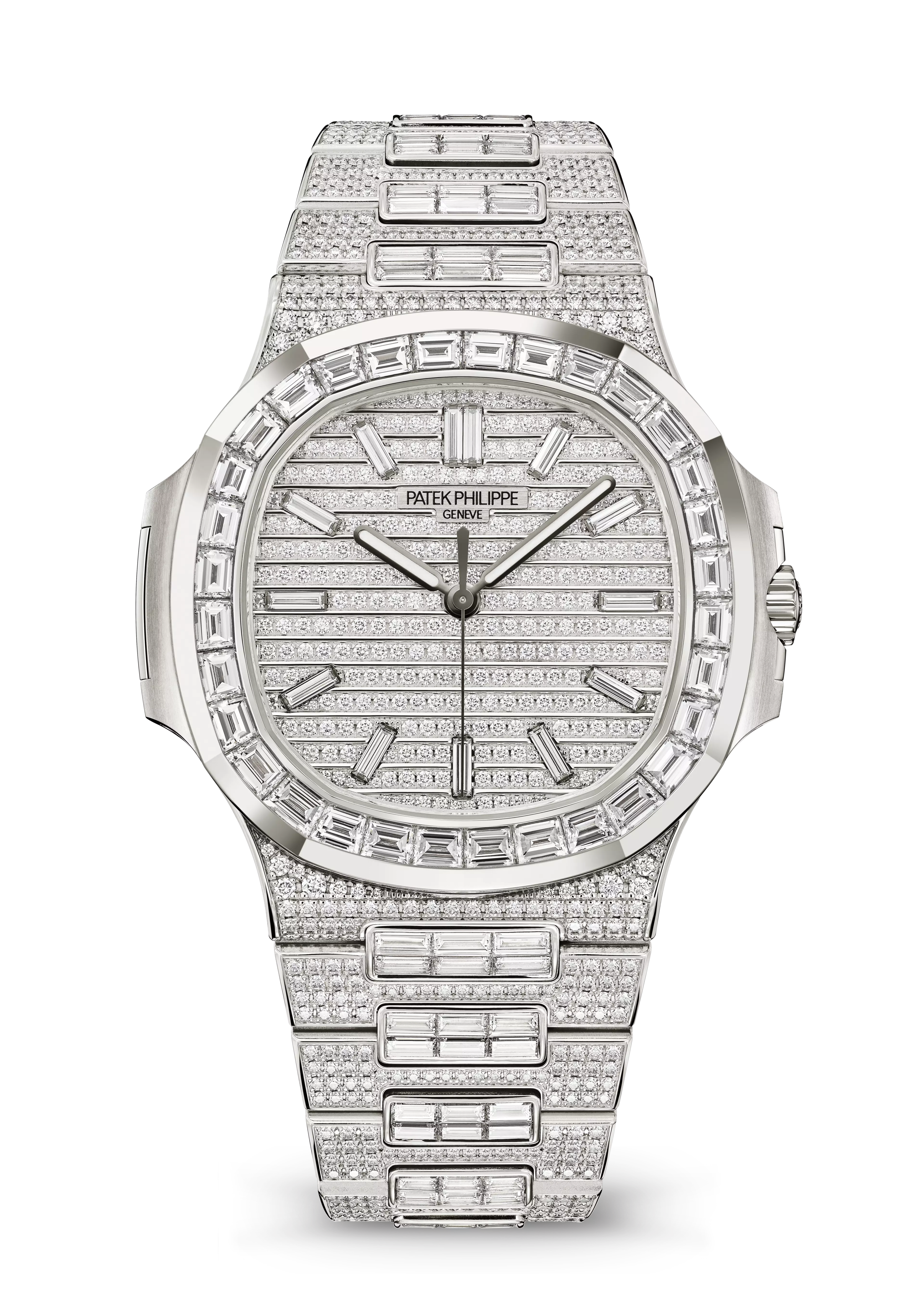 A glittering masterpiece adorned with 1,285 brilliant-cut diamonds (6.43 ct) and 195 baguette-cut diamonds (13.27 ct)—meticulously arranged to highlight the Nautilus’ signature form, including the case, bezel, dial, and full bracelet. The interplay of brilliant and baguette cuts creates a striking “brick-like” patterned sparkle while preserving the model’s sporty elegance. It reflects Patek Philippe’s mastery in combining high watchmaking with fine jewellery.