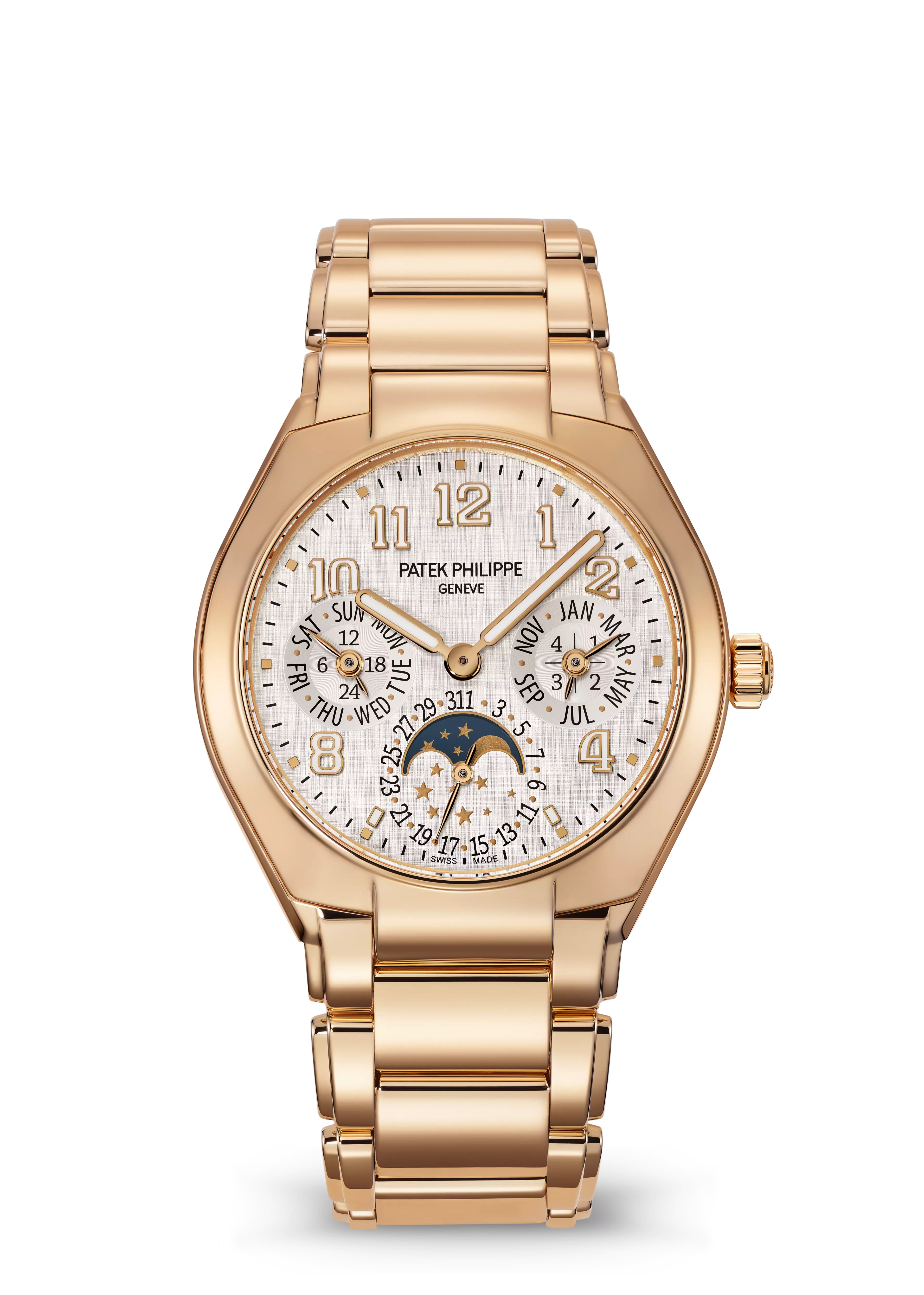 The 7340/1R-001 features an exquisite rose gold bracelet seamlessly integrated with the case, exemplifying Patek Philippe’s dedication to design cohesion. Its bezel is adorned with 52 flawless Top Wesselton diamonds using the Flamme® technique. It enhances brilliance by exposing more facets. The gem-setting is flawlessly executed to preserve symmetry and sparkle. The supple, hand-polished bracelet links provide both visual harmony and a luxurious, comfortable fit on the wrist.